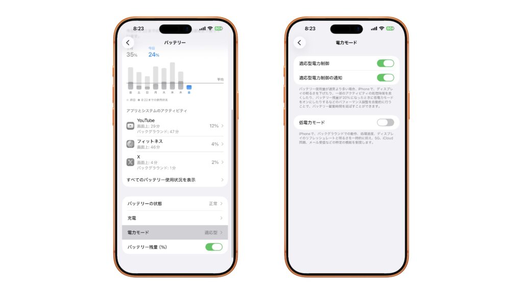 最短で効くのはこれ。iPhoneには低電力モードに加え、状況に応じて調整する適応型電力もあります。(support.apple.com)