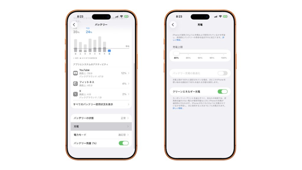 対応モデルでは充電上限を80〜100%の範囲で設定できます。Appleは「満充電で過ごす時間を減らして寿命を伸ばす」目的を明記しています。(support.apple.com)